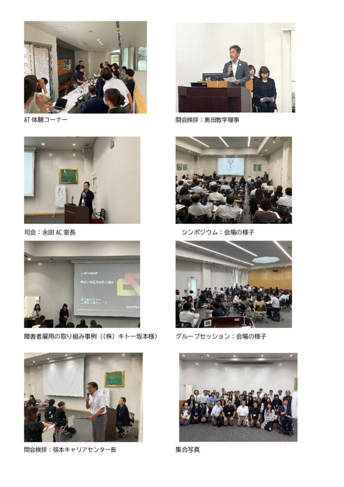 タウンミーティングは2部制で構成され、第1部のシンポジウムでは、PHED、HEAPから話題提供として、各大学の取り組み事例等の報告がありました。その後、本学アクセシビリティ・コミュニケーション支援室から「支援室の概要」、キャリアセンターから「キャリアセンターから見た課題について」報告がありました。最後に(株)キトーより「障害者雇用の取り組み」について、事例を交えた報告があり、参加者はメモを取りながら熱心に耳を傾けていました。